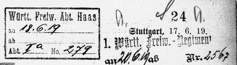 Mit Auflösung der Freiwilligen-Abteilung Haas im Sommer 1919 wurde das 1. Württ. Freiwilligen-Regiment